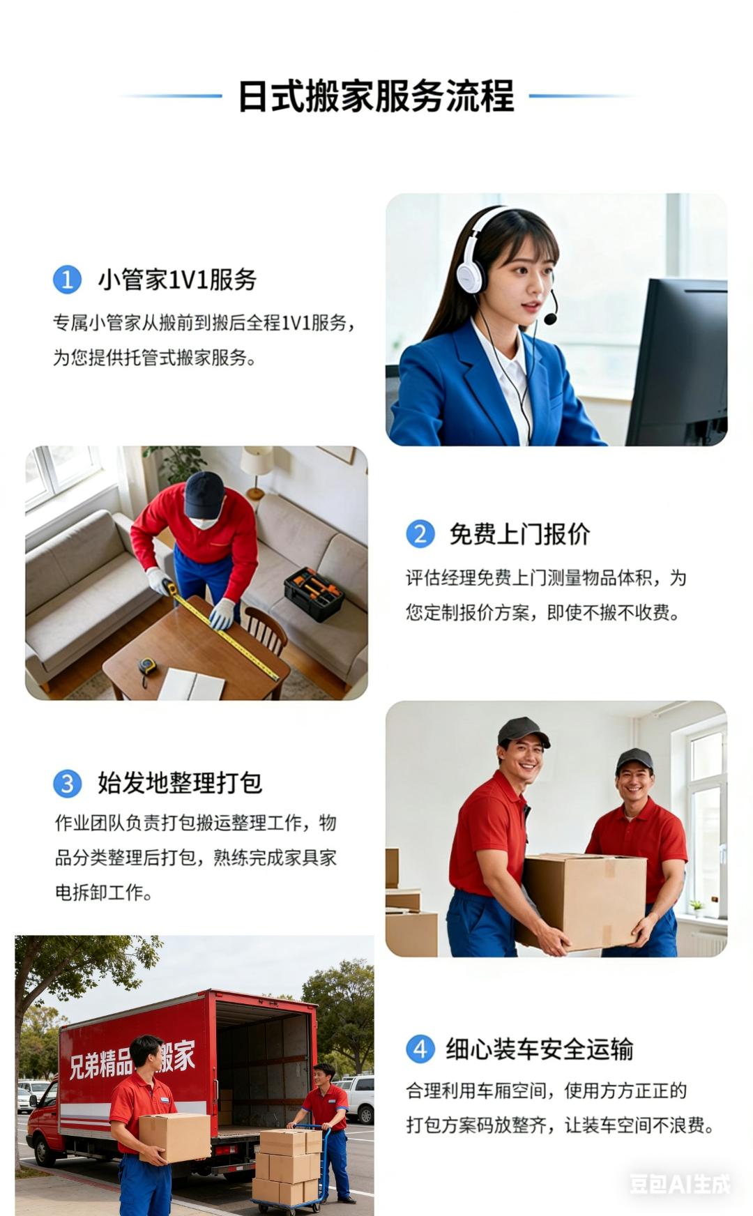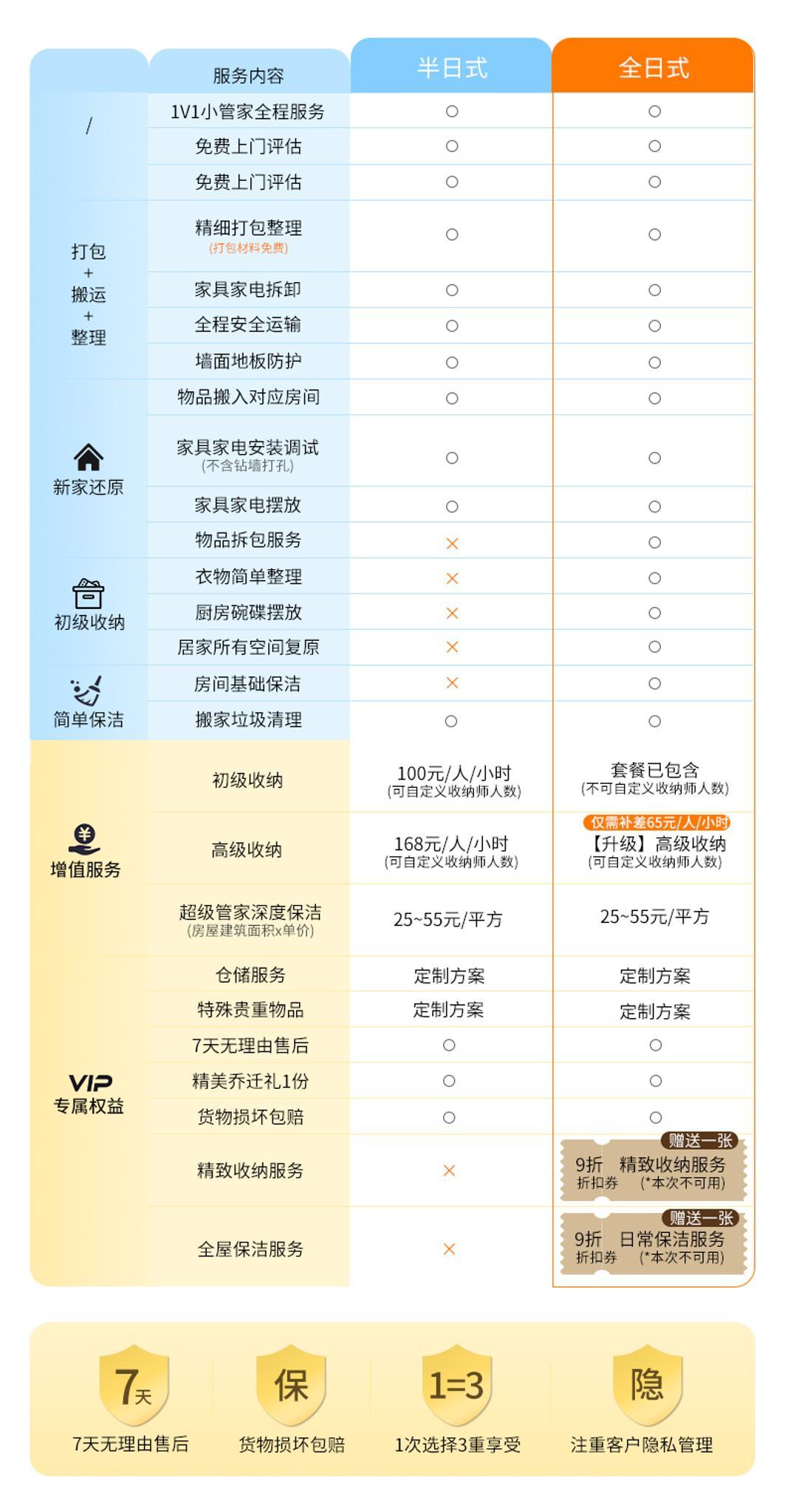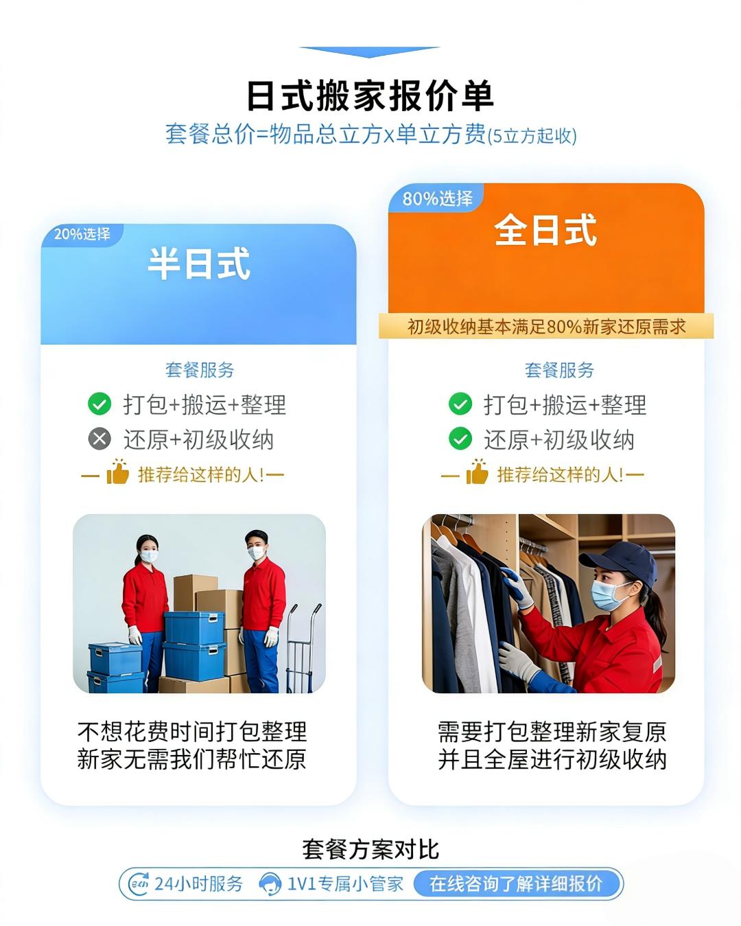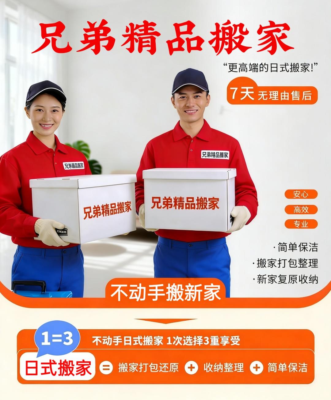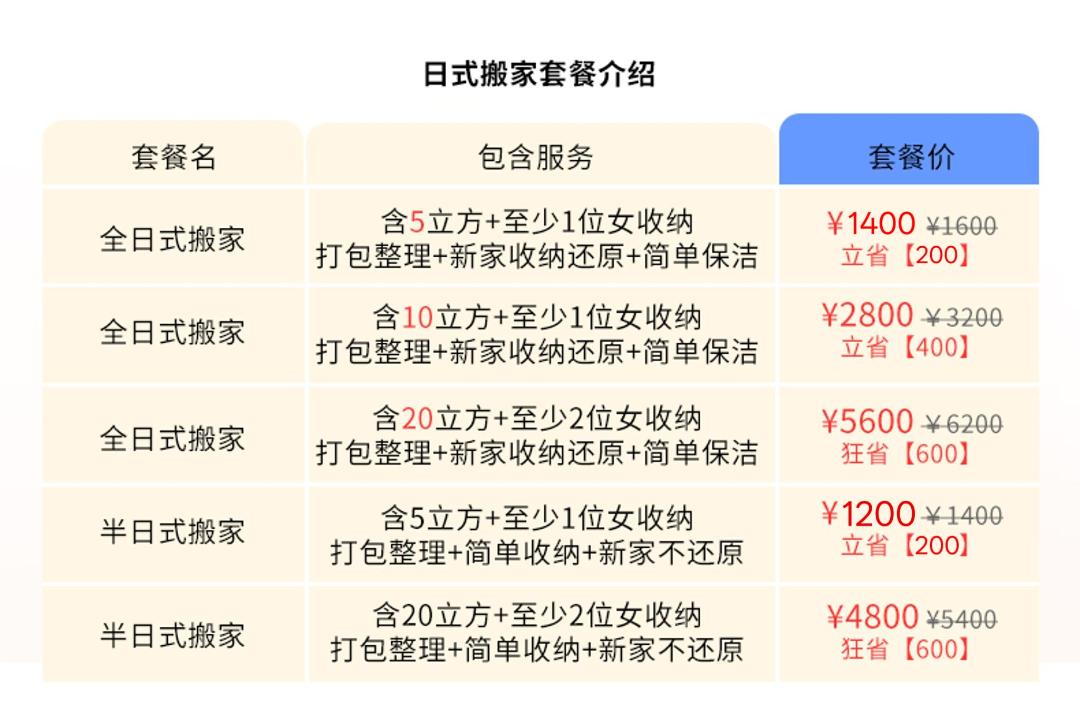 日式搬家(解放双手,搬家无烦恼,轻松搬新家) 师傅培训后上岗服务,多年日式搬家经验 此项目为一站式服务厢式货车(4.2米长*2米宽*2米高) 半日式搬家240元/立方,5个立方起步。 全日式搬家280元/立方,5个立方起步。 50公里之外每公里7元。 1、咨询客服,根据家里物品情况,预估所需材料,预约搬家时间。 2、随车1-8人服务,打包、收纳、运输、家具拆卸安装,物品还原摆放(根据客户情况安排人数。需要女收纳师请提前备注)。 3、材料不收费、拆装不收费、无电梯楼层不收费、50公里内免费,师傅全程搬运,定制方案,让你有个愉快的搬家体验。 4、旧址家具拆装所有行李随身物品收纳打包装箱 搬运,易碎物品打包保护。 5、新家家具免费安装(空调、热水器、等特殊电器需要提前备注,其它电器根据现场情况确定能否安装)。 6、搬出和搬入地址表面垃圾清理。 7、超重物品(钢琴、大型保险柜、大型鱼缸、单件超150公斤以上物品)按收费标准另外计费。 8.空调加坲100元/压力,换管120元/米,砖墙打孔100元/个,水泥墙孔150元/个 注意事项: 1.运输途中产生的相关费用(过路费、停车费等)需由客户承担; 2.搬家服务不提供水电燃气拆装服务; 3.名贵、易碎物品(如古董、名贵艺术品、高档瓷器等)建议单独购买保险或轻相关专业人员进行搬运; 服务保障: 1.明码标价:服务中可能产生的额外收费项都将按照收费标准进行收费;按实际工作量收取费用,请在到位平台支付。 2.全程搬运:搬运师傅全程打包搬运,无需自己动手。