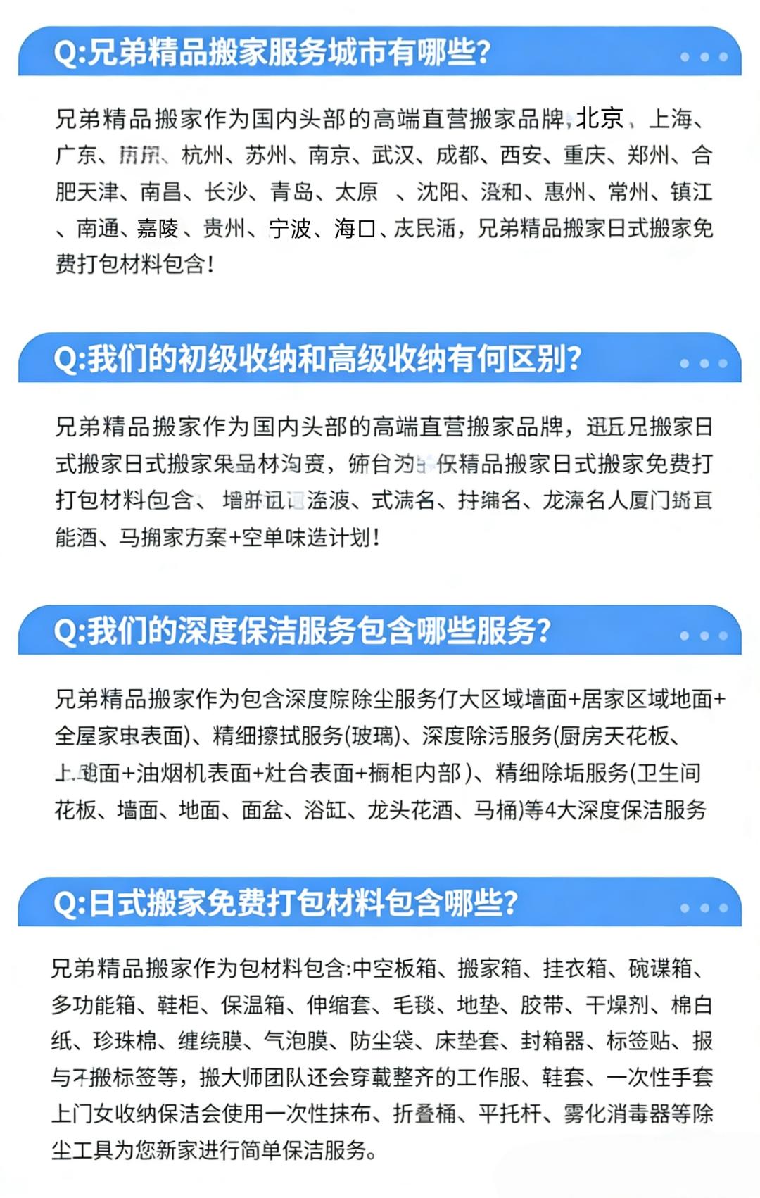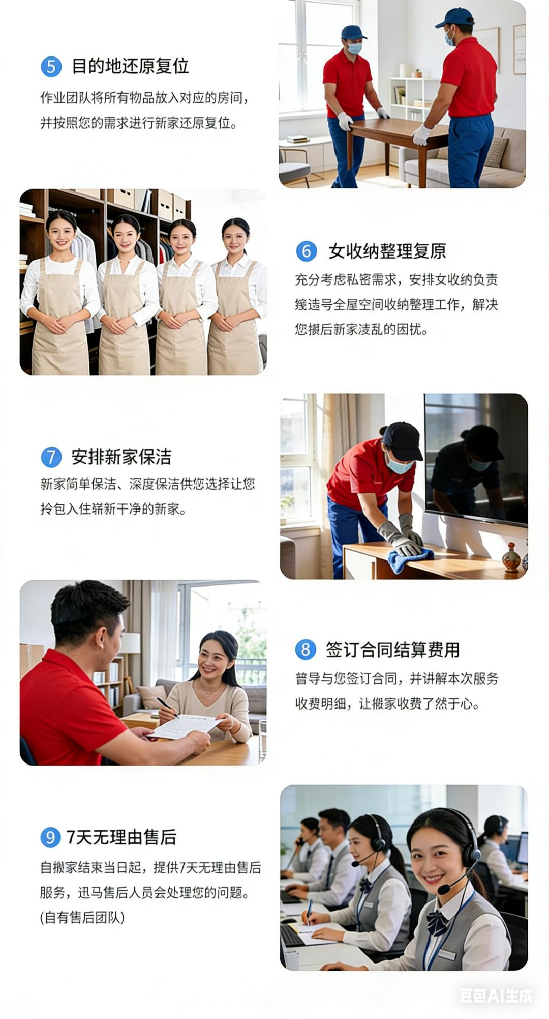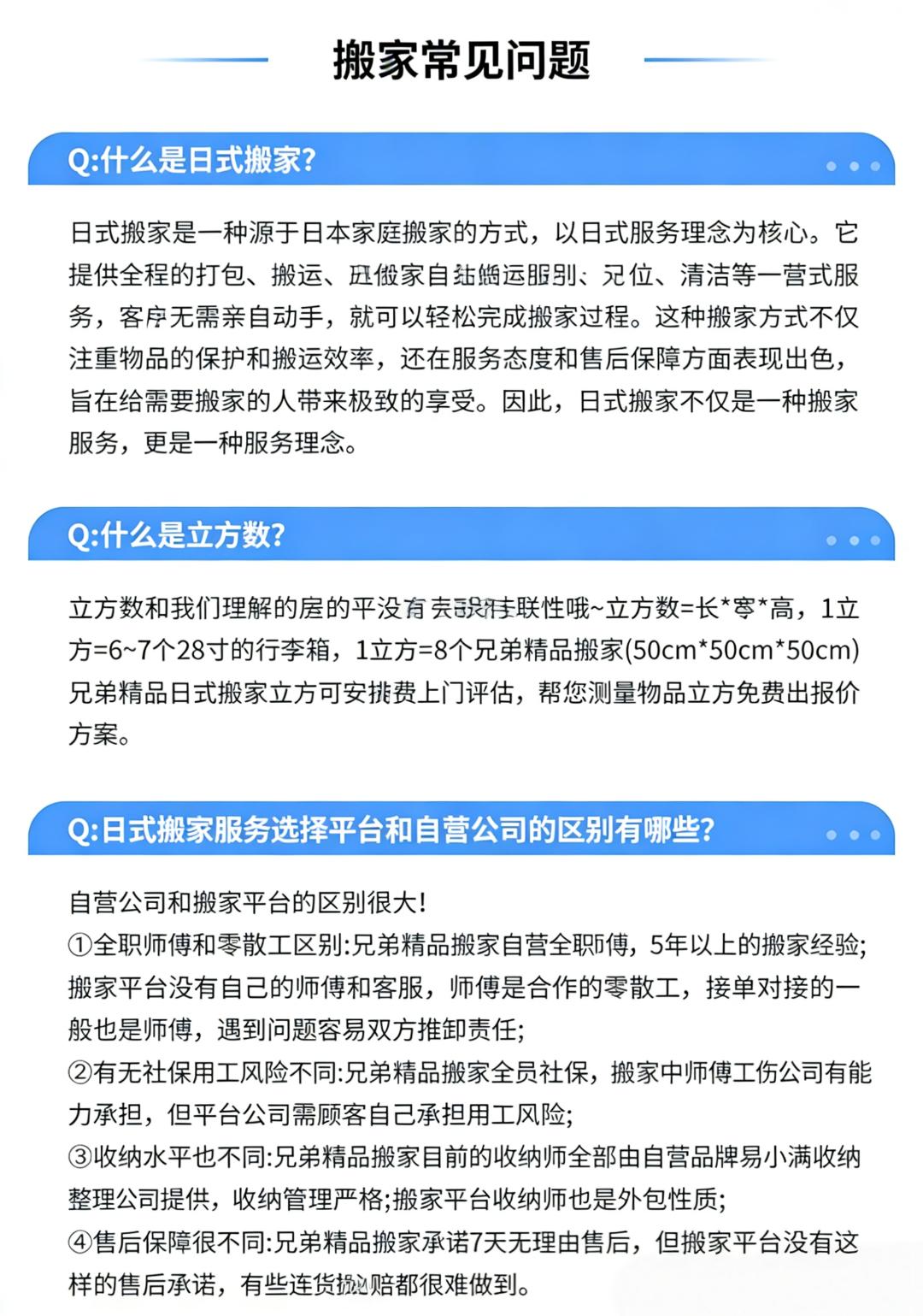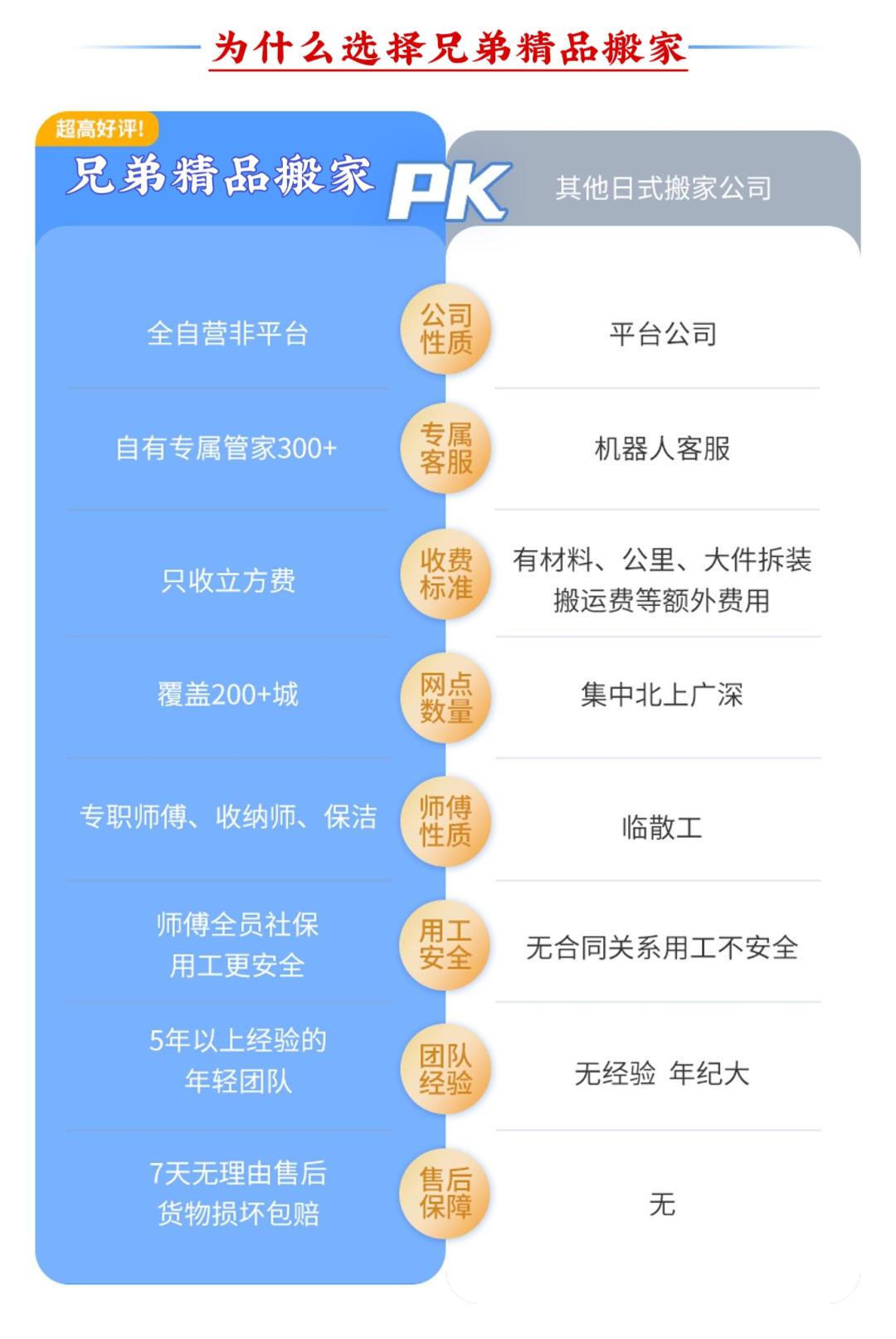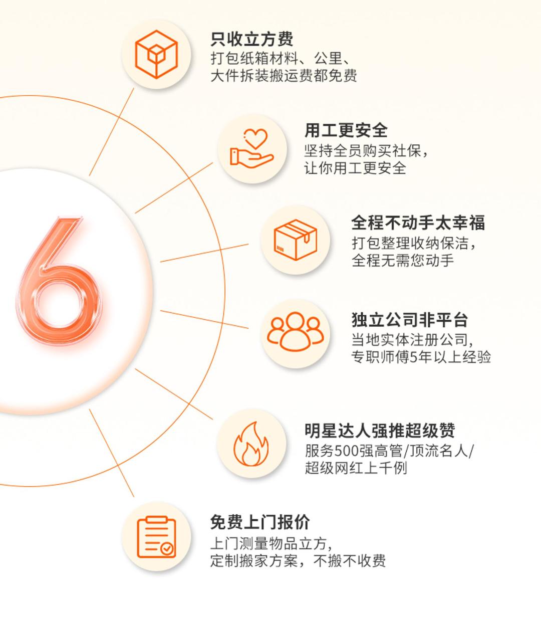 日式搬家(解放双手,搬家无烦恼,轻松搬新家) 师傅培训后上岗服务,多年日式搬家经验 此项目为一站式服务厢式货车(4.2米长*2米宽*2米高) 半日式搬家240元/立方,5个立方起步。 全日式搬家280元/立方,5个立方起步。 50公里之外每公里7元。 1、咨询客服,根据家里物品情况,预估所需材料,预约搬家时间。 2、随车1-8人服务,打包、收纳、运输、家具拆卸安装,物品还原摆放(根据客户情况安排人数。需要女收纳师请提前备注)。 3、材料不收费、拆装不收费、无电梯楼层不收费、50公里内免费,师傅全程搬运,定制方案,让你有个愉快的搬家体验。 4、旧址家具拆装所有行李随身物品收纳打包装箱 搬运,易碎物品打包保护。 5、新家家具免费安装(空调、热水器、等特殊电器需要提前备注,其它电器根据现场情况确定能否安装)。 6、搬出和搬入地址表面垃圾清理。 7、超重物品(钢琴、大型保险柜、大型鱼缸、单件超150公斤以上物品)按收费标准另外计费。 8.空调加坲100元/压力,换管120元/米,砖墙打孔100元/个,水泥墙孔150元/个 注意事项: 1.运输途中产生的相关费用(过路费、停车费等)需由客户承担; 2.搬家服务不提供水电燃气拆装服务; 3.名贵、易碎物品(如古董、名贵艺术品、高档瓷器等)建议单独购买保险或轻相关专业人员进行搬运; 服务保障: 1.明码标价:服务中可能产生的额外收费项都将按照收费标准进行收费;按实际工作量收取费用,请在到位平台支付。 2.全程搬运:搬运师傅全程打包搬运,无需自己动手。