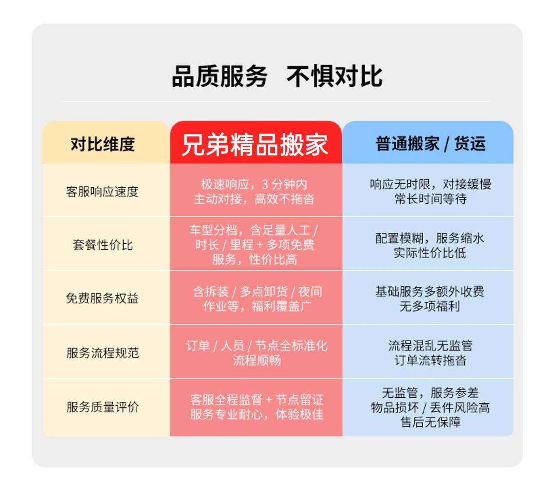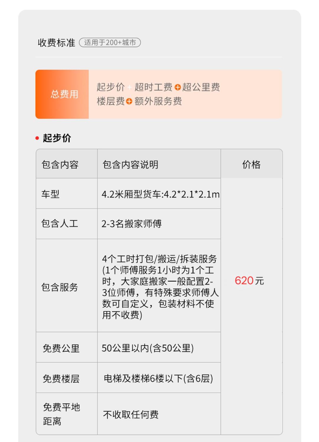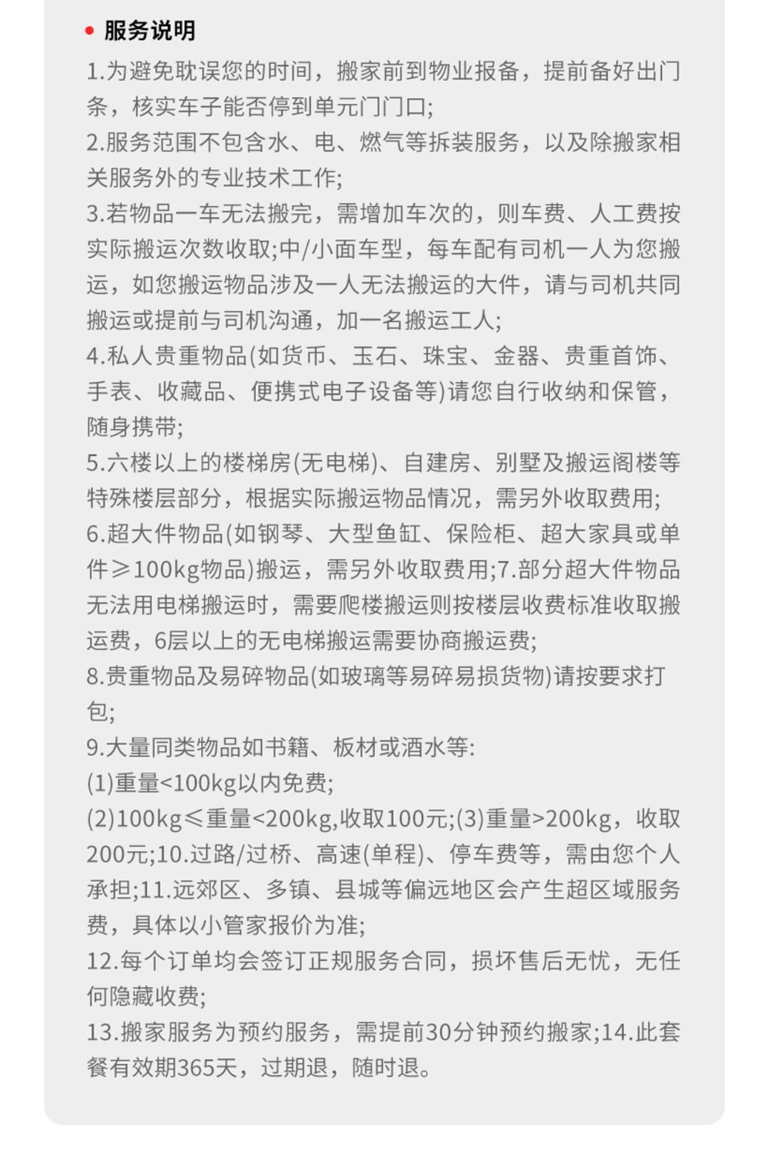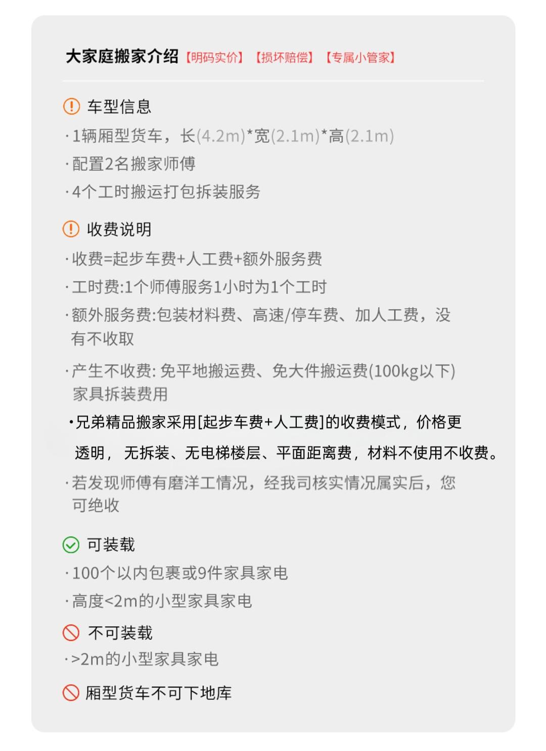 1.220元一车,每人每小时100元 适合运大件家具、家电、多件行李,贵重物品 车辆介绍:4.2米长,2米高,2米宽 里程费:含10公里,超出按7元/公里计费 2.家具拆装不收费,家电不收费,楼层不收费,平面距离不收费,包装不收费,公里不收费! 3.空驶费: 车辆到位后,客户取消用车时,每车次收200元 4.等时费: 车辆到位后,因为客户原因不能提供搬运服务时,每小时100元 附加费: 1、家庭健身器材、保险柜、每件收取50-200元 2、搬运钢琴: (1)钢琴型号为120(含)以下时,加收260元; (2)钢琴型号为120以上-125(含)以下时,加收300元; (3)钢琴型号为125以上-130以下时,加收400元; (4)钢琴型号为130(含)以上或三角钢琴加收600-800元/台; 单运钢琴收费标准:价格不低于当日车次起价费 3、纸箱收费: 中箱60cmX40cmX40cm,15元/个;小箱(书箱)48cmX33cmX33cm,10元/个; 4、气泡膜3元/米 5、拉伸膜100元一卷40公分厚,50公分宽 服务保障: 1.明码标价: 服务中可能产生的额外收费项,都 将按照下方收费项目收费 2.全程搬运: 搬运师傅全程搬运,无需自己动手。